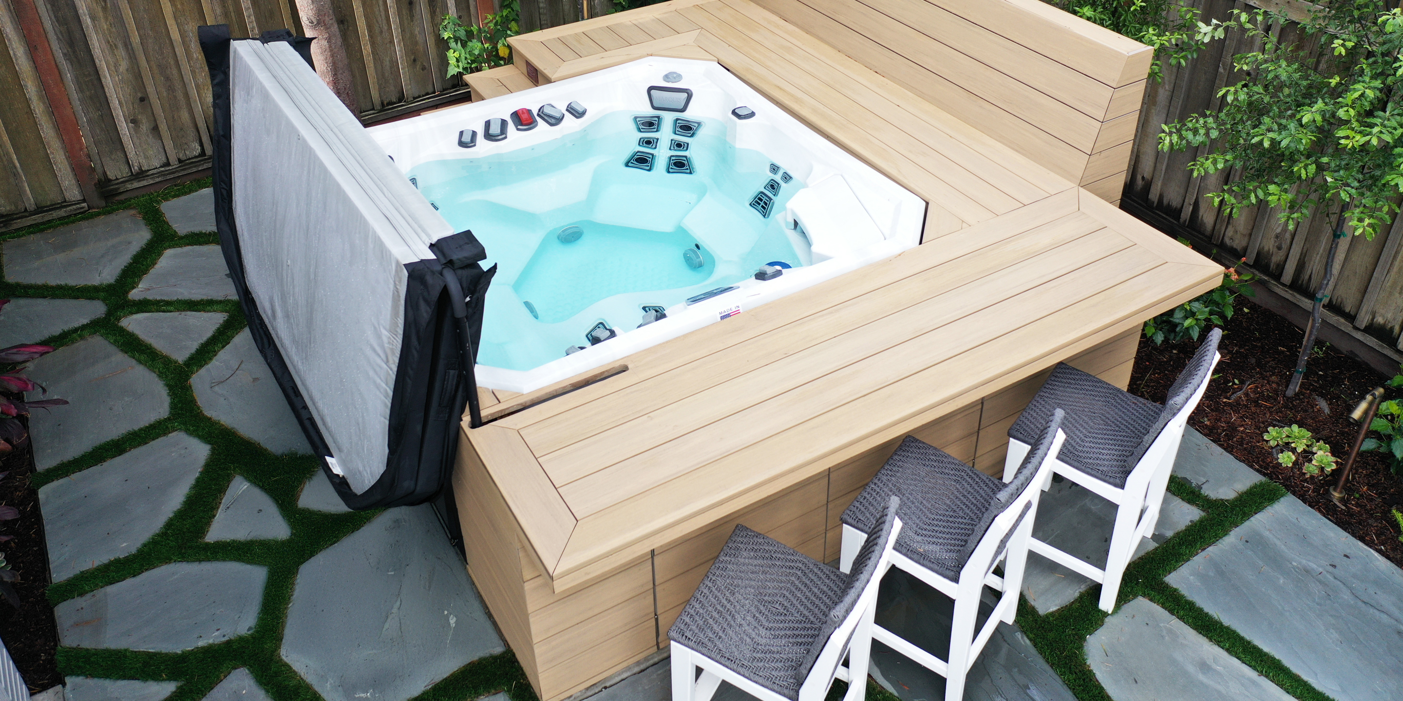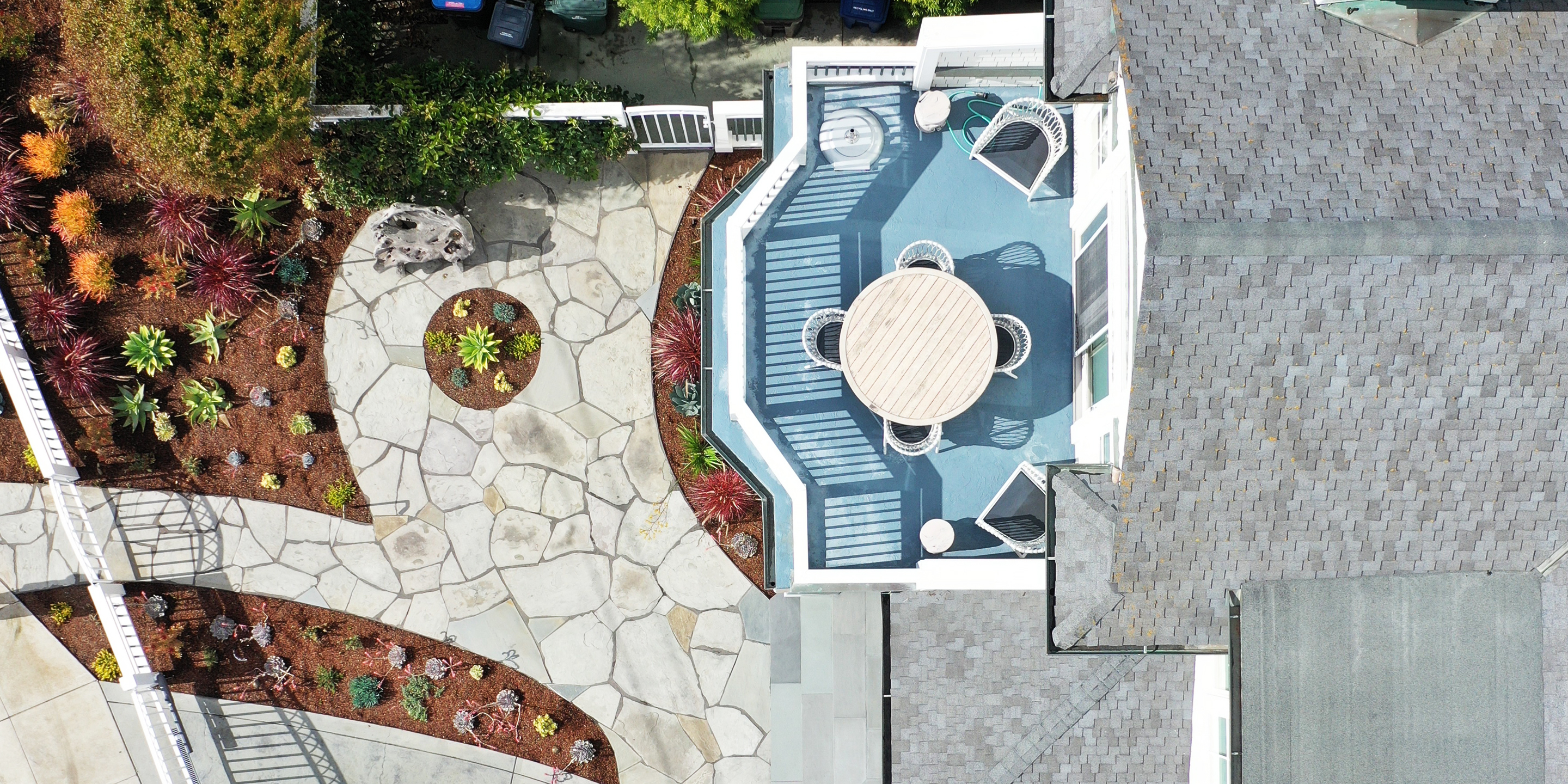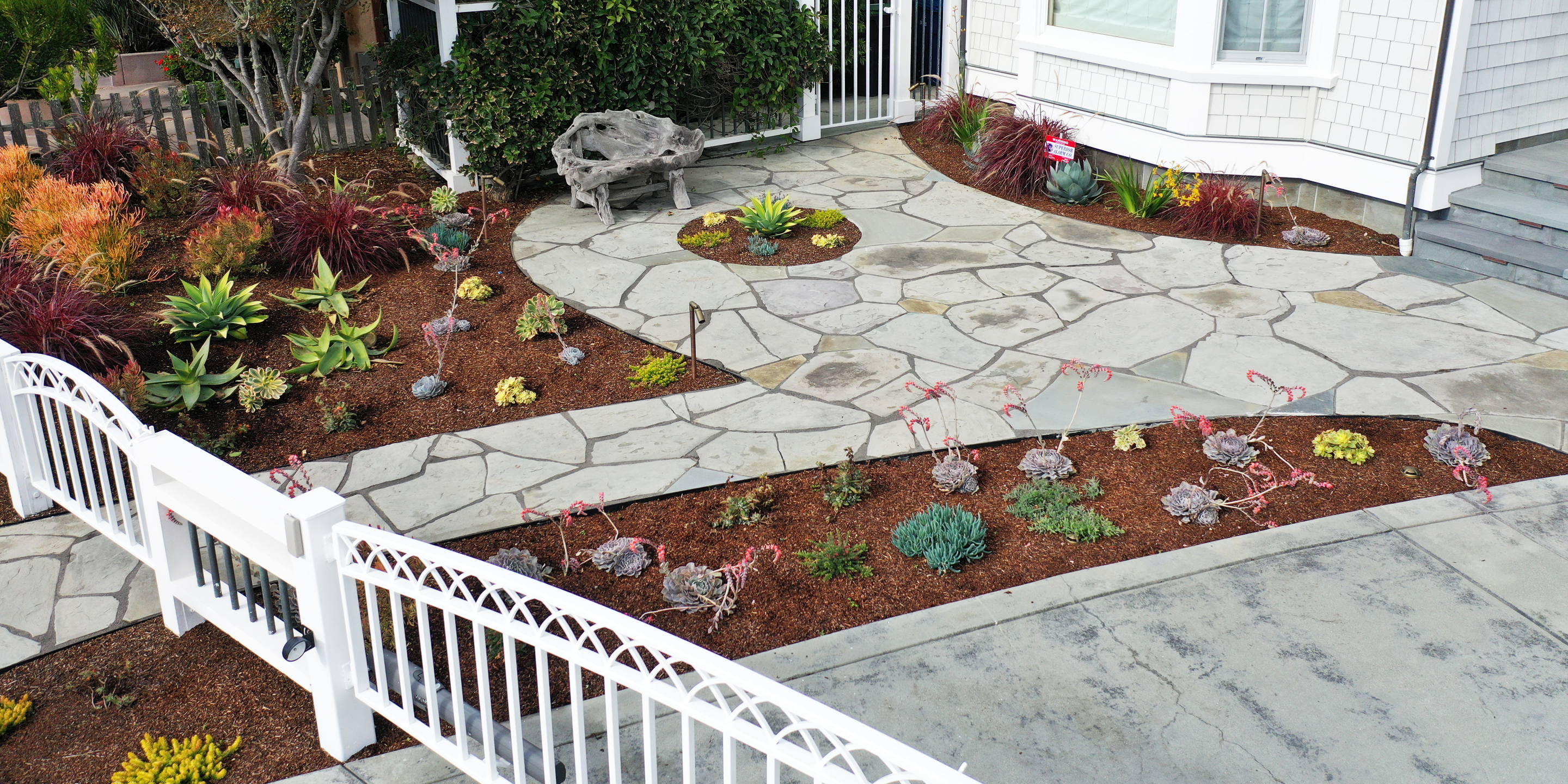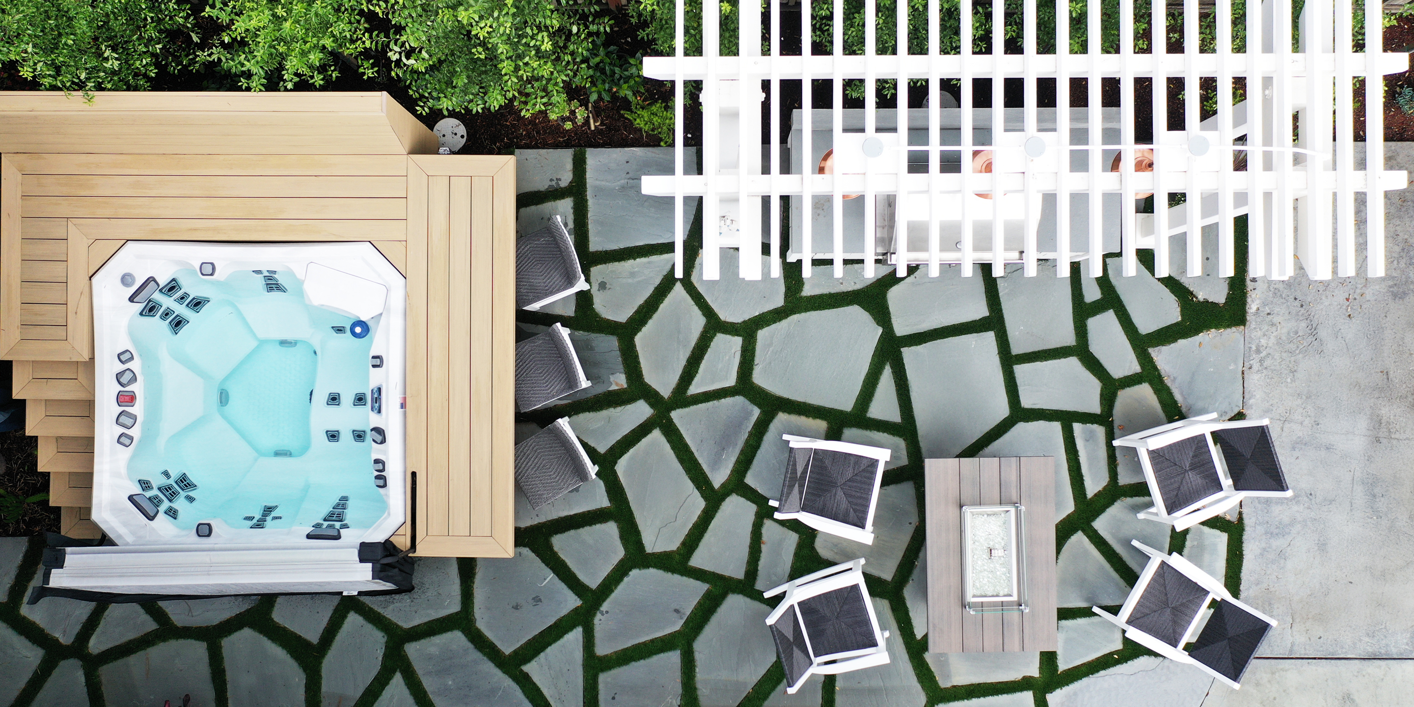 Keeping in theme with the bright and airy Craftsman architectural style of this coastal California home, SSA developed a lush and colorful planting plan with complimentary landscape design incorporating classic design elements. The priority was adding privacy in the backyard, extending the backyard living space, and creating a cohesive landscape plan. Amenities include site lighting, trellis over outdoor kitchen, stone and turf patio with flexible seating areas, and a built-in hot tub surround with bench and bar seating.