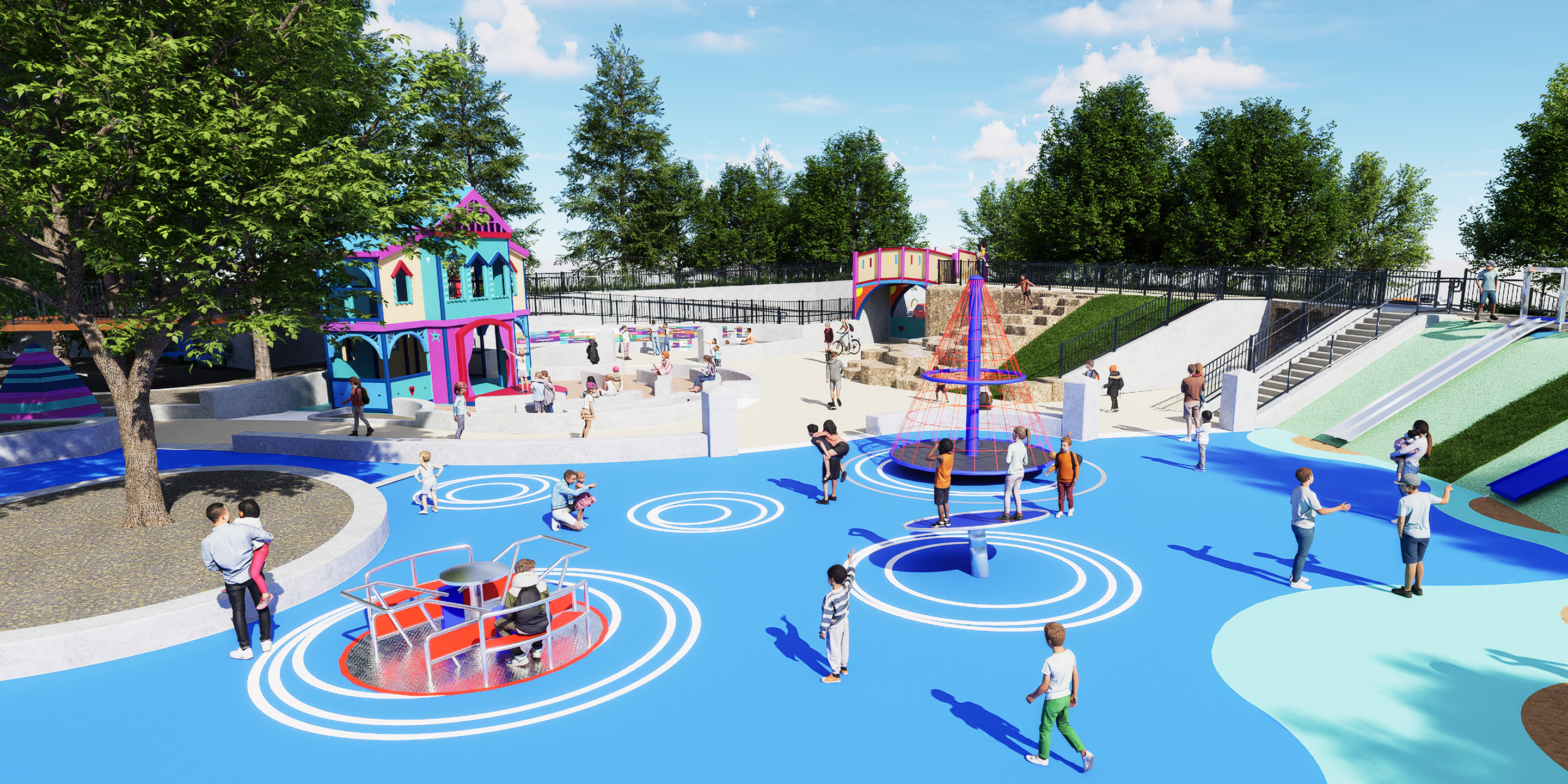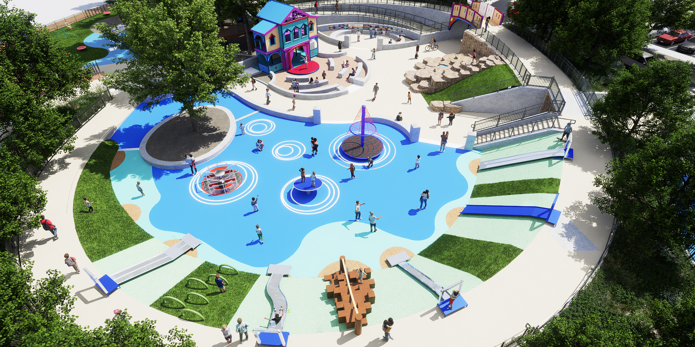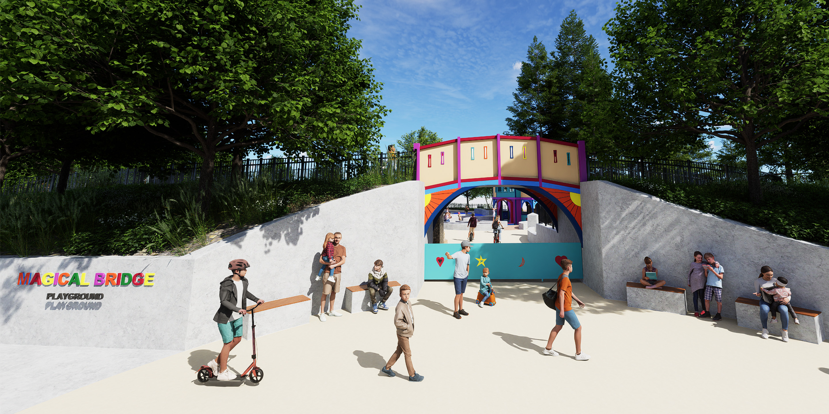 The playground project received funding from the Magical Bridge Foundation, a non-profit organization with the mission to create play for all. This manifested into creative play spaces that far exceed the Americans with Disabilities Act or universal playgrounds. Magical Bridge playgrounds intend to serve children and adults alike with any disability, including physical, visual, cognitive, or social.